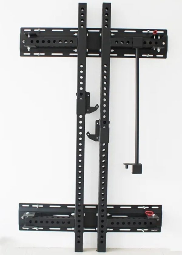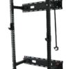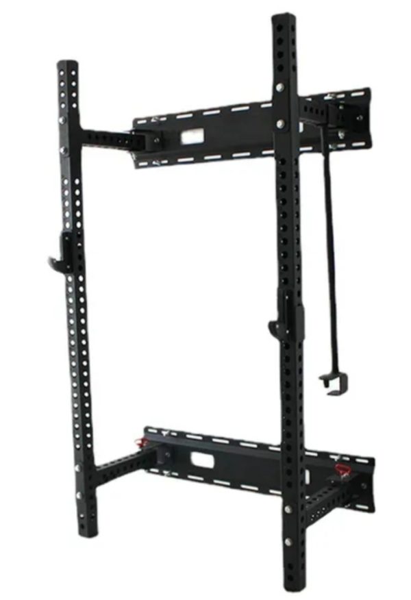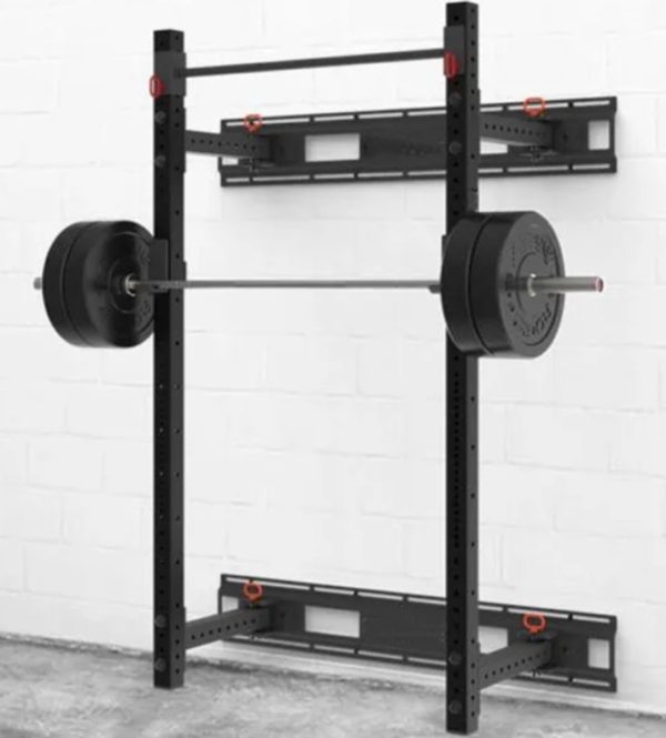 The Wall Mount Foldable Squat rack is amazing for those who are in small spaces or want to be able to heavy lift and then get the rack out of the way after use. It measures 90 inches tall, 50 inches wide and it comes 2 feet off the wall when open.